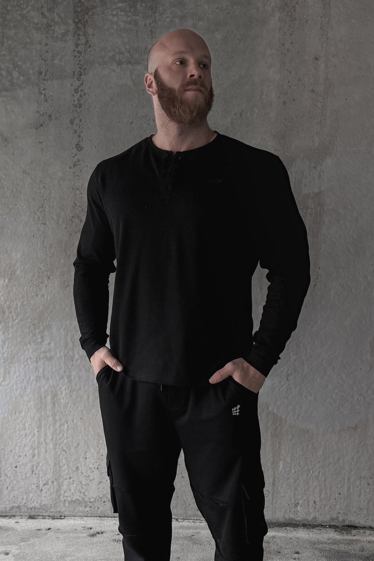 Waffle Knit Henley Long Sleeve T-Shirt - Black